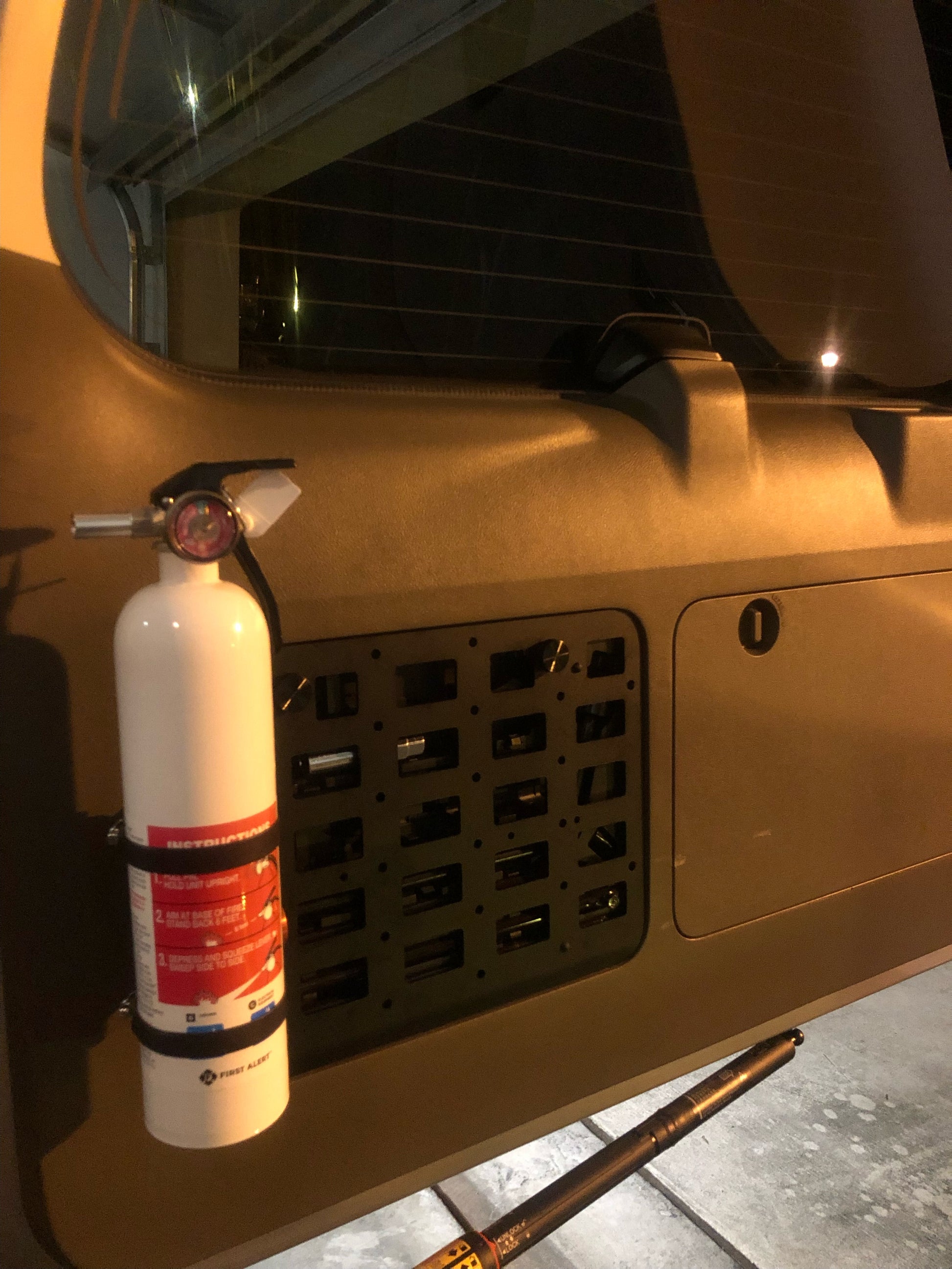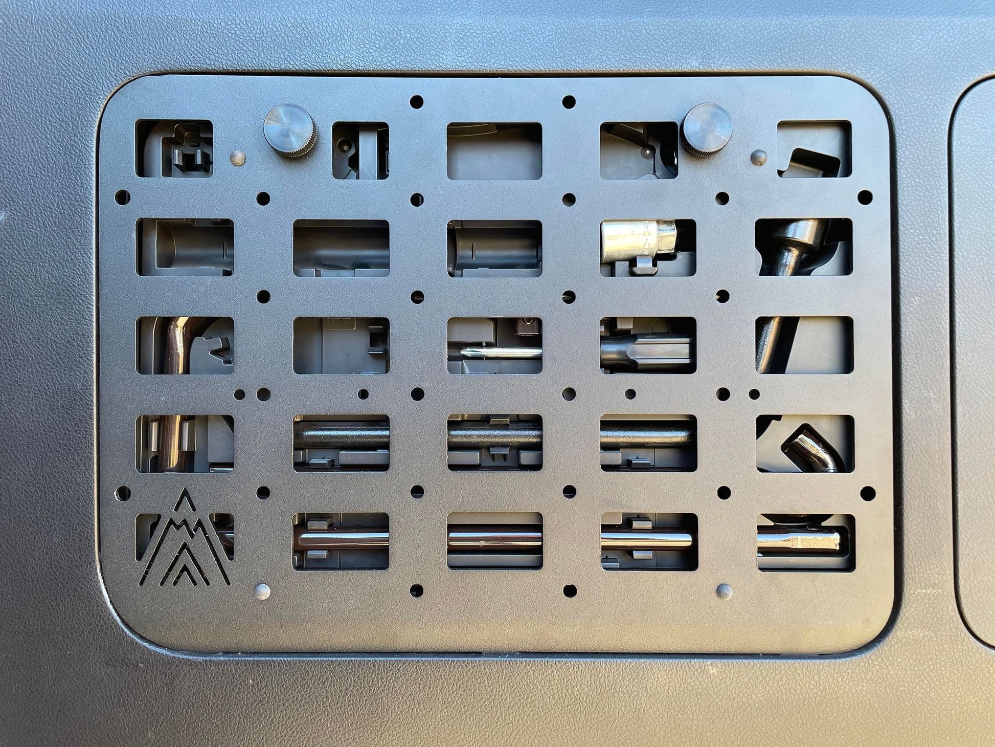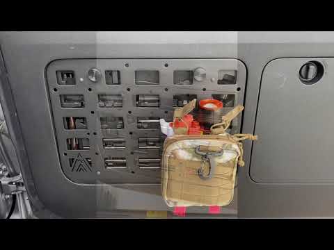 This MOLLE panel replaces the OEM plastic tool box cover. Install is easy and takes less than 5 minutes, requiring no drilling or permanent modifications and maintains access to the OEM tools. The only installation tools needed are a flat head screw driver and 1/2" wrench. Laser cut out of 1/8" steel and powder coated with a extremely durable matte black textured finish, this panel will hold up great on the trail. Unlocking and gaining access to behind the MOLLE panel just requires unscrewing the two knobs on the front of the MOLLE panel and it will rotate forward. Tightening the knobs keeps the MOLLE panel close against the tools and keeps the OEM tools from rattling on the trail. If you have removed the OEM tools then the panel will just tighten against the door plastic and give you extra space behind the MOLLE panel for storage.