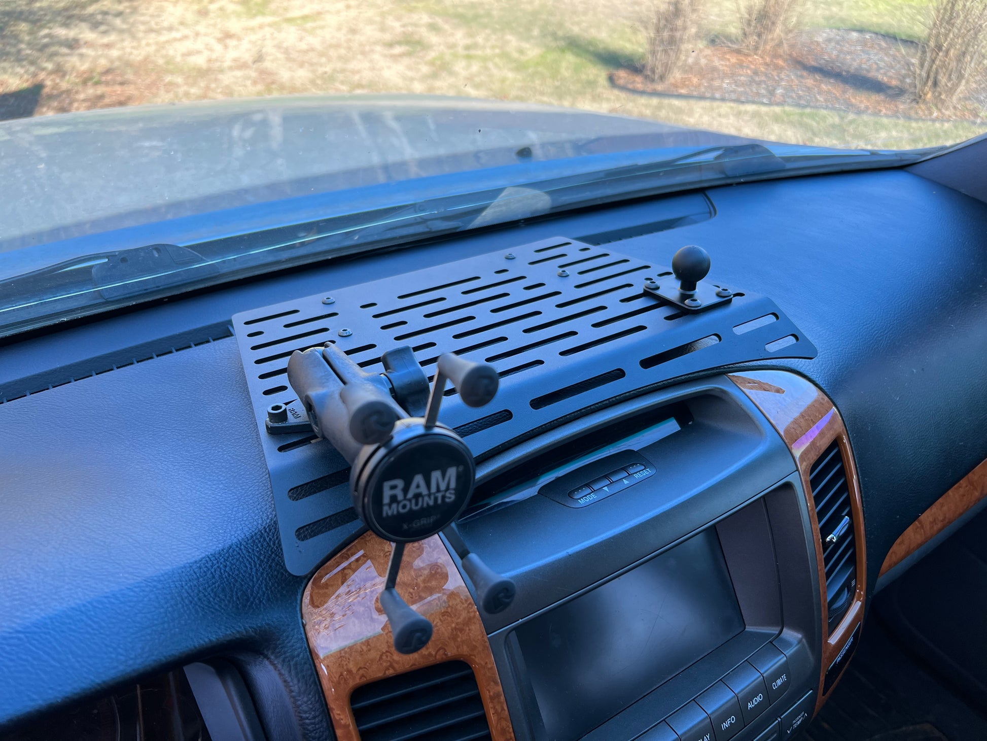 Attach a phone mount, radio or GoPro to this GX470 dash mounted MOLLE panel. This easy to install MOLLE requires no tape or drilling for install and is completely bolt on. The 1/8” plate has a large area to securely mount many of your rigs accessories and is easy to install and remove for moving and adding more accessories. The matte black powder coated finish is durable and reduces glare so this panel will look great for a long time.